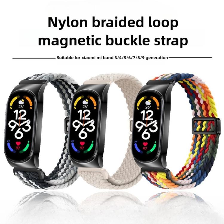 Correa de reloj elástica trenzada de nailon con hebilla magnética y marco de metal para Xiaomi Smart Band 9/8 (arcoíris)