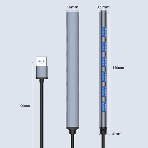 • Velocidad de transmisión teórica de hasta 5 Gbps; incluye 1 Puerto USB 3.0 y 6 Puertos USB 2.0; longitud del Cable de 90 mm; cuerpo de Cable de PVC resistente a la Flexión con junta reforzada; núcleo de alambre grueso galvanizado con blindaje multicapa para transmisión estable; dimensiones 150x16x8,5 mm