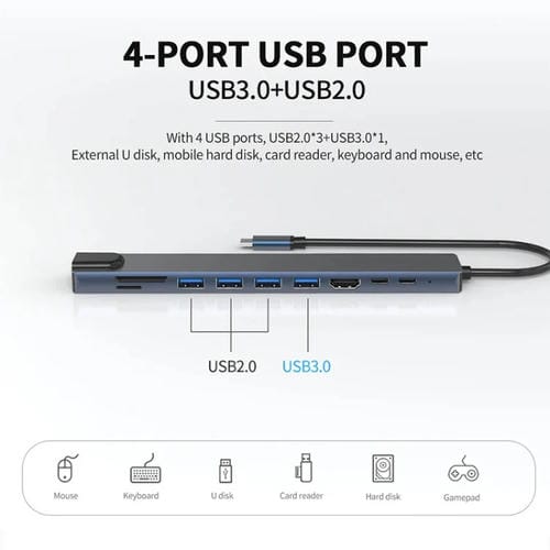 • Dimensiones: 19x3x1,1 cm; longitud del Cable: 21 cm; interfaces: 2 x Type-C, 3 x USB 2.0, 1 x USB 3.0, 1 x HDMI, 1 x Puerto de red RJ45, Lector de Tarjetas SD/TF