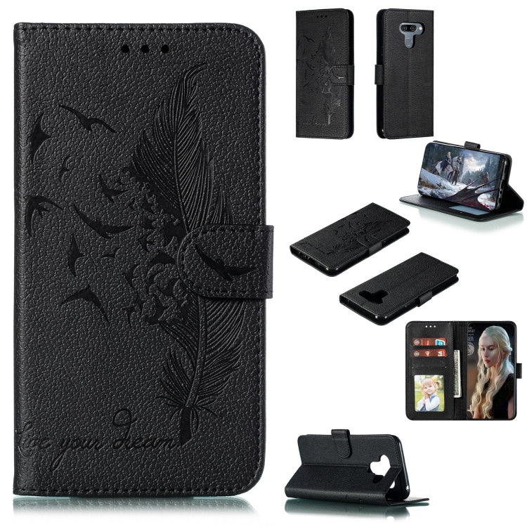 Estuche de Cuero LG K50 con Tapa Horizontal, Textura Litchi, Patrón Plumas, Billetera y Soporte (Negro)