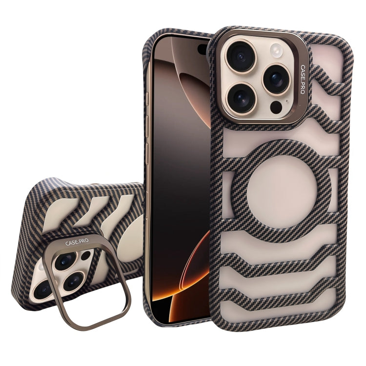 Estuche para Teléfono Magsafe con Soporte Protección Lente Fibra de Carbono para iPhone 16 Pro Max (Dorado)