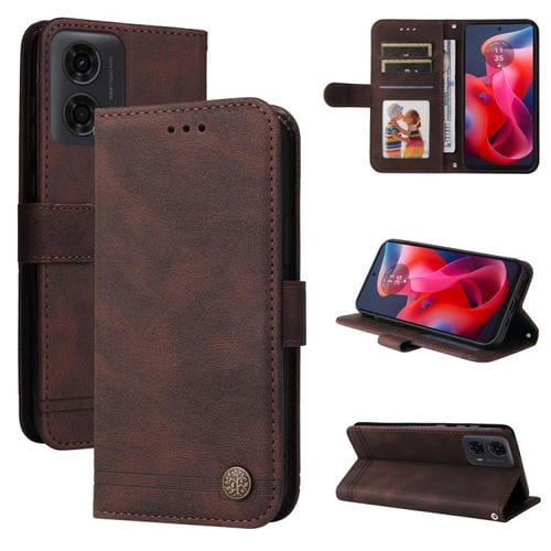 Funda de Cuero Motorola Moto G04/G04S/G24/E14 con Botones de Metal y Árbol de la Vida (Marrón)