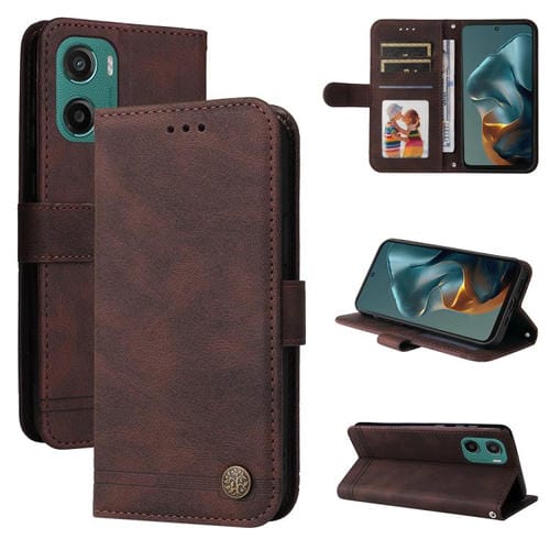 Funda de Cuero para Motorola Moto G05/E15 con Botones de Metal y Diseño Árbol de la Vida (Marrón)