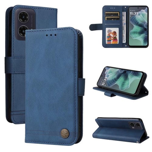 Funda de Cuero para Motorola Moto G35 con Botones de Metal y Diseño Árbol de la Vida (Azul)