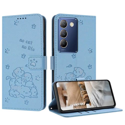 Funda de Cuero con Estampado de Gatito y Cordón para Vivo Y100 Idn / Y200E 5G (Azul)