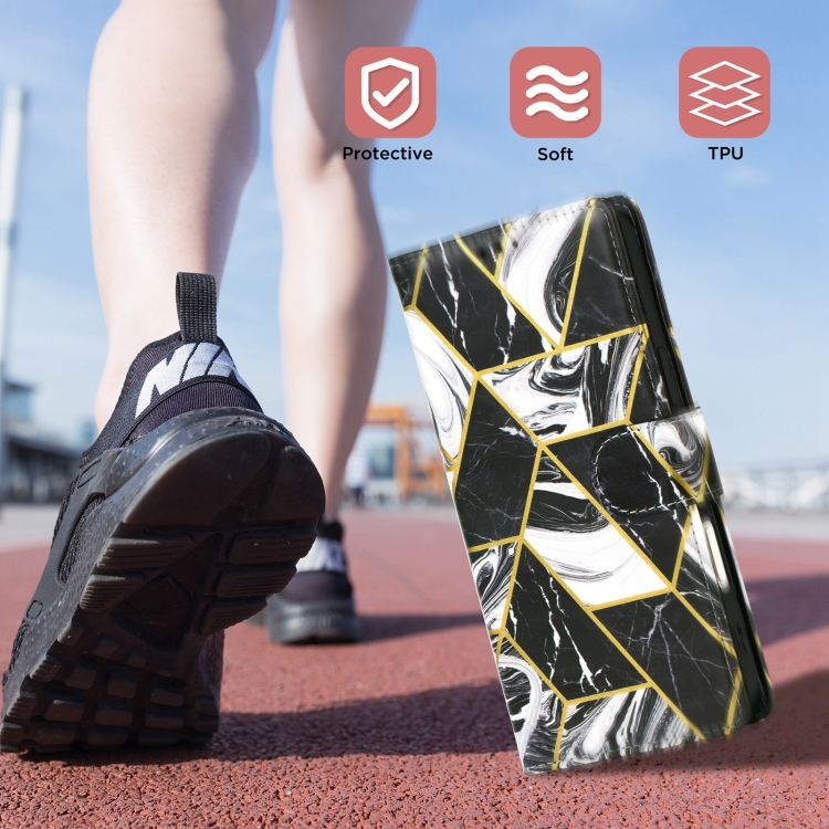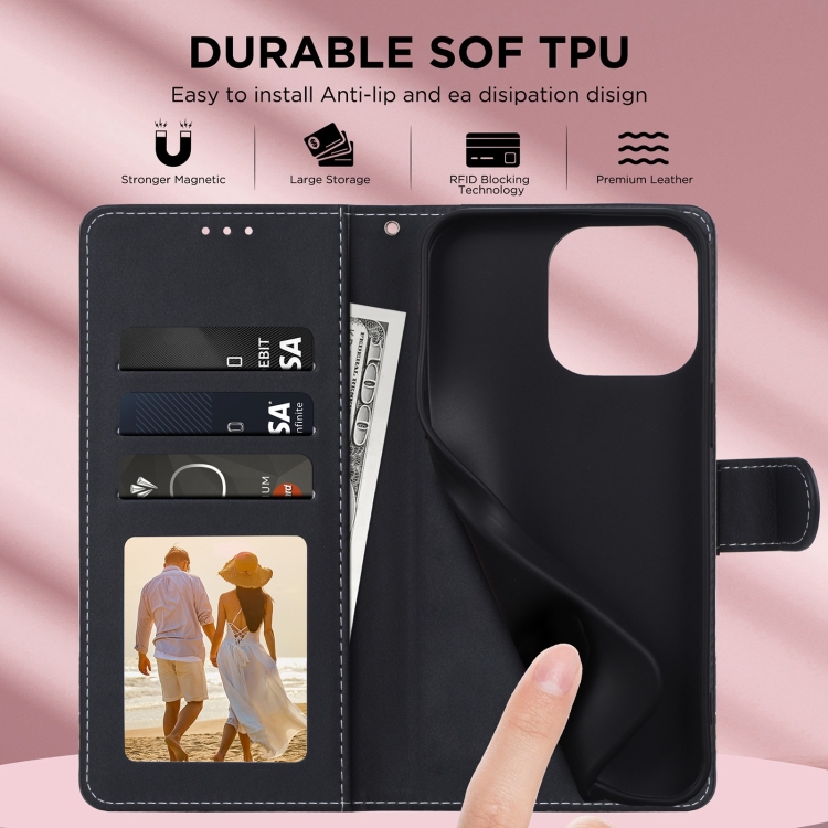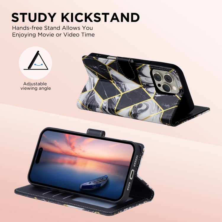 Funda de Cuero para iPhone 16 Pro Max con Costuras en Bronce y Mármol (Negra)