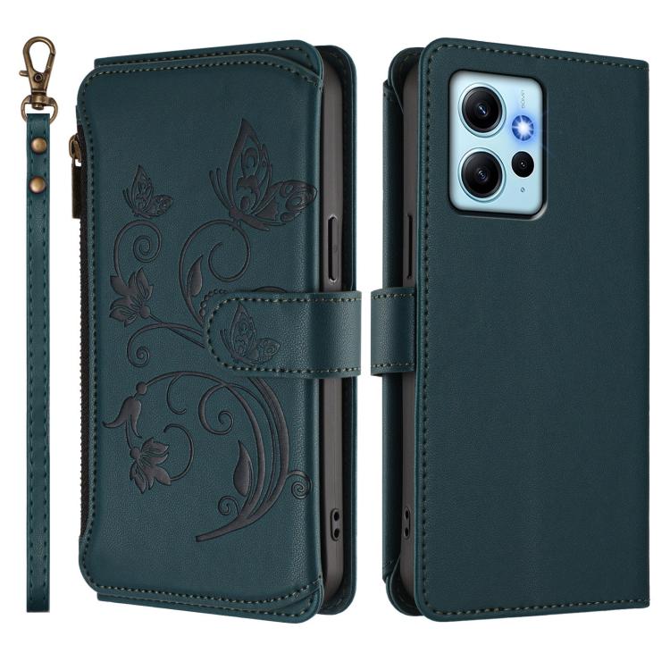 Funda de cuero con cremallera para Redmi Note 12 4G Global, diseño de mariposas, flores y amor, con múltiples tarjetas (verde oscuro)