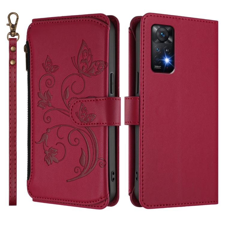 Funda de cuero con cremallera para Redmi Note 12 Pro 4G / Note 11 Pro 5G, diseño de mariposas, flores y múltiples tarjetas (rojo vino)