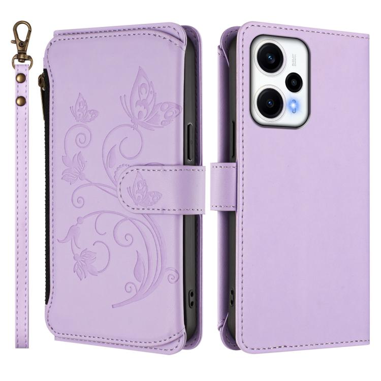 Funda de cuero con cremallera para Redmi Note 12 Turbo / Xiaomi Poco F5, diseño de mariposas y flores (morado claro)