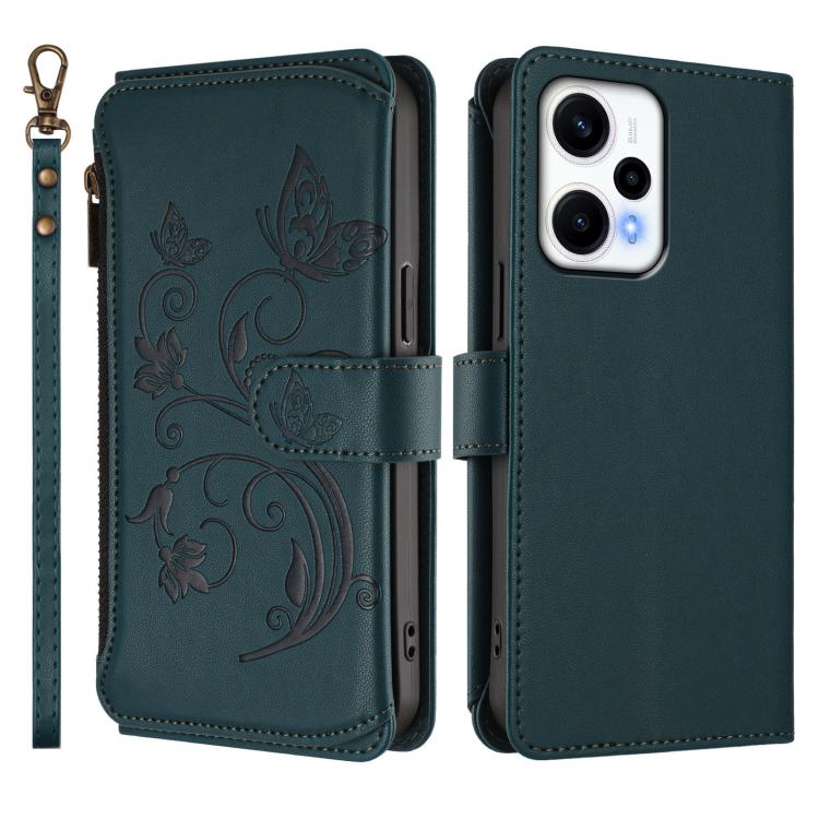Funda de cuero con cremallera para Redmi Note 12 Turbo / Xiaomi Poco F5, diseño de mariposas y flores (verde oscuro)