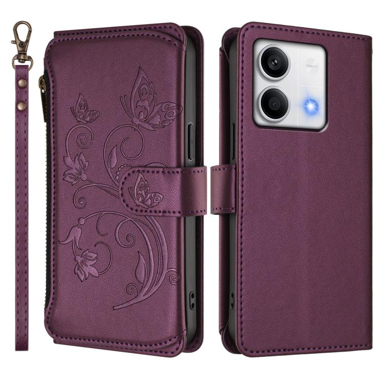 Funda de cuero con cremallera para Redmi Note 13 5G, diseño de mariposas, flores y múltiples tarjetas (morado oscuro)
