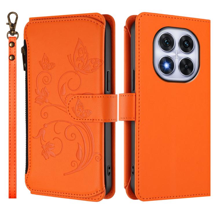 Funda de cuero con cremallera para Redmi Note 14 Pro 4G, diseño de mariposas, flores y mariposas (naranja)