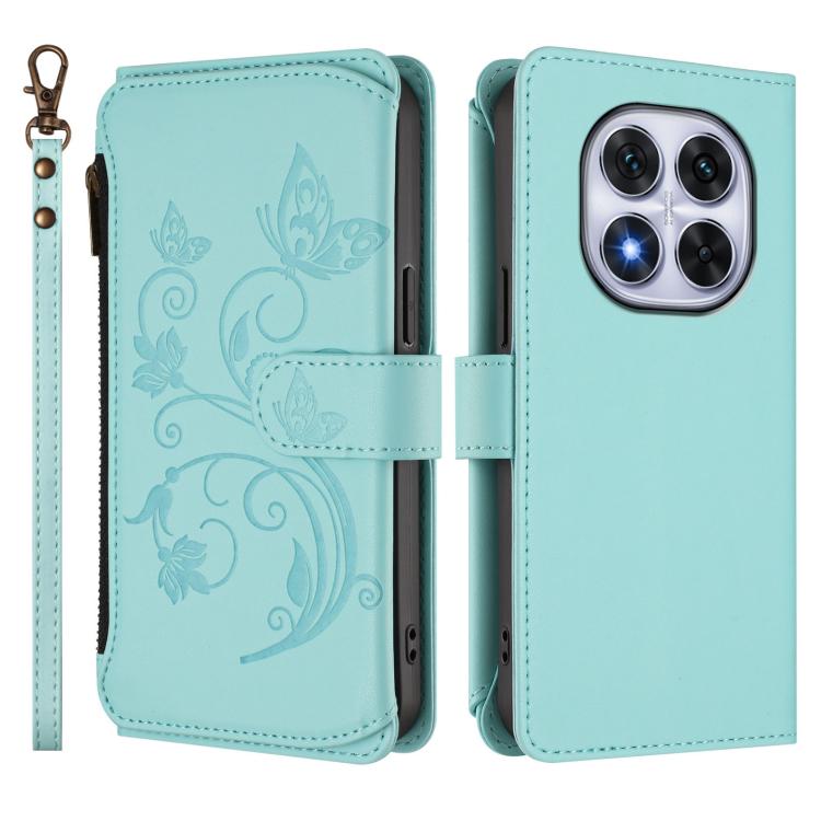 Funda de cuero con cremallera para Redmi Note 14 Pro 4G, diseño de mariposas y flores, con múltiples tarjetas (verde menta)