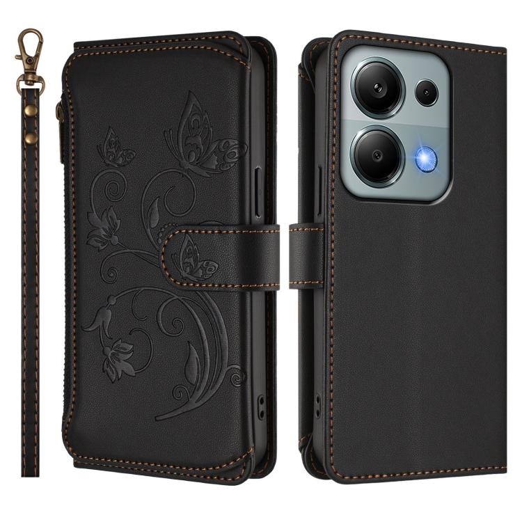 Funda de cuero con cremallera para Redmi Note 14S 4G / Note 13 Pro 4G, diseño de mariposas y flores, con múltiples tarjetas (negro)
