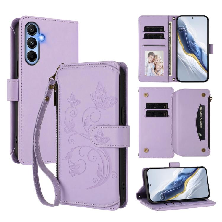 Funda de cuero con cremallera para Samsung Galaxy A15 4G/5G, diseño de mariposas, flores y amor, con múltiples tarjetas (morado claro)