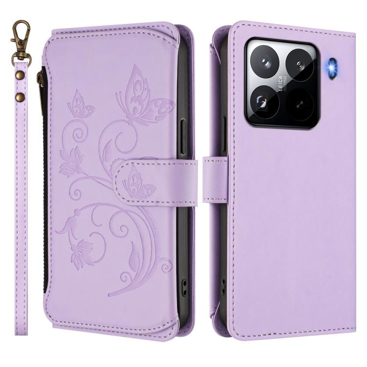Funda de cuero con cremallera para Xiaomi 15 Pro, diseño de mariposas, flores y múltiples tarjetas (morado claro)