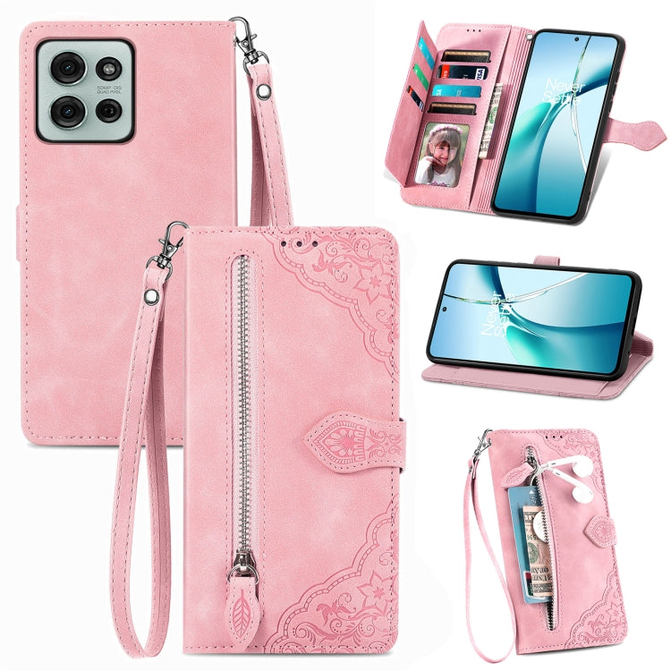 Funda de Cuero con Cremallera y Flores en Relieve para Motorola Moto G75 5G (Rosa)