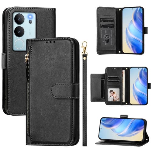 Funda de Cuero con Cremallera y Ranuras para Múltiples Tarjetas para Vivo V29E 5G / Y200 5G (Negro)