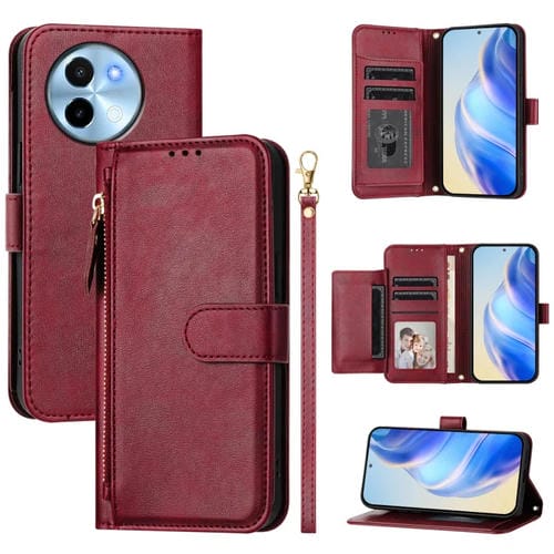 Funda de Cuero con Cremallera y Ranuras para Múltiples Tarjetas para Vivo Y38 5G / Y200I / T3X (Rojo Oscuro)