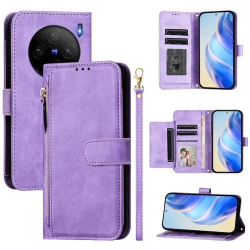Funda de Cuero con Cremallera y Ranuras para Varias Tarjetas para Vivo X100S 5G (Morado)