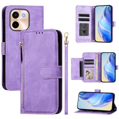 Funda de Cuero con Cremallera y Ranuras para Varias Tarjetas para Vivo Y28 4G (Morado)