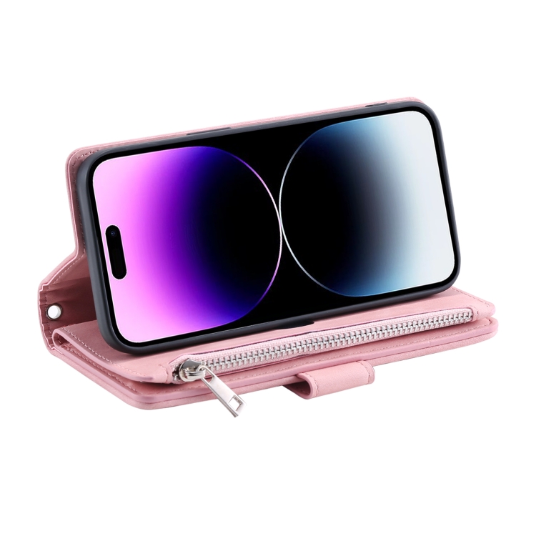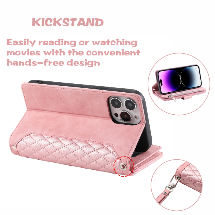 Funda de Cuero con Cremallera Textura de Cuadrícula para iPhone 16 Pro Max con Cordón (Oro Rosa)