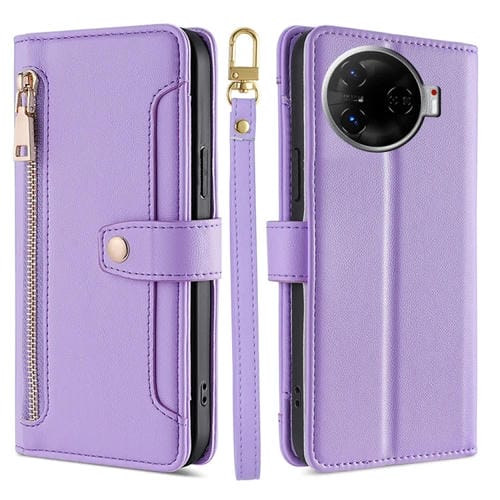 Funda de Cuero con Cremallera y Textura de Oveja para Tecno Camon 30 Pro 5G (Morado)