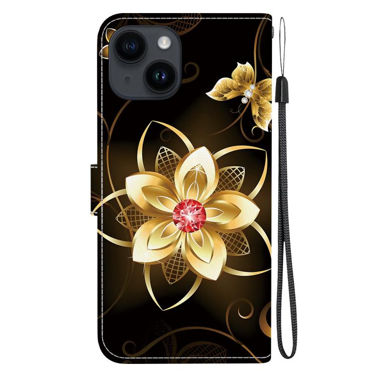 Funda de Cuero para iPhone 15 Plus con Dibujo de Colores y Textura de Cristal (Flor Dorada)