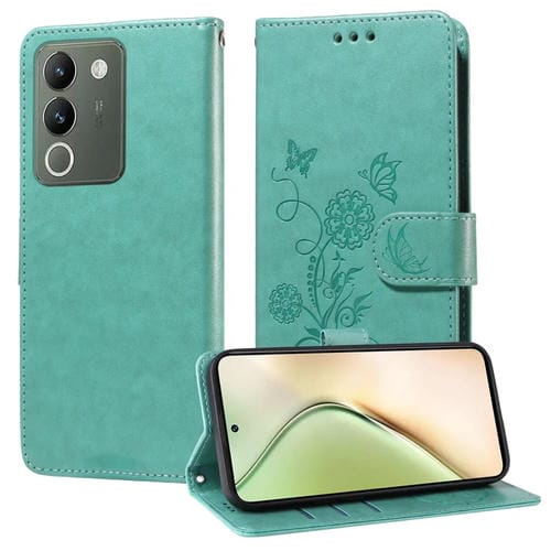 Funda de Cuero con Diseño de Mariposas y Flores En Relieve para Vivo Y200/V29E (Verde)