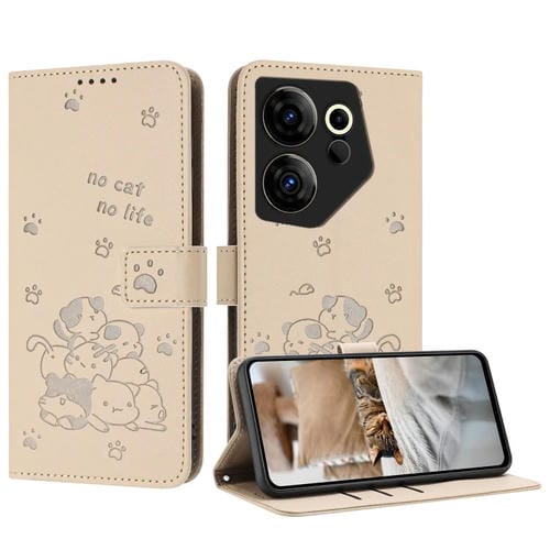 Funda de Cuero Tecno Camon 20 Premier con Diseño de Gatito en Relieve y Cordón (Beige)