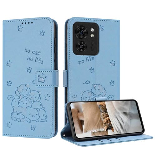 Funda de Cuero Motorola Edge 40 con Diseño de Gatito En Relieve y Cordón (Azul)