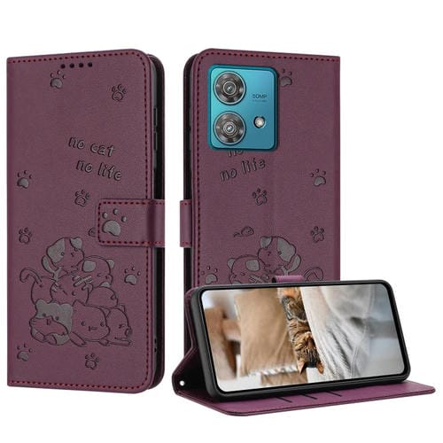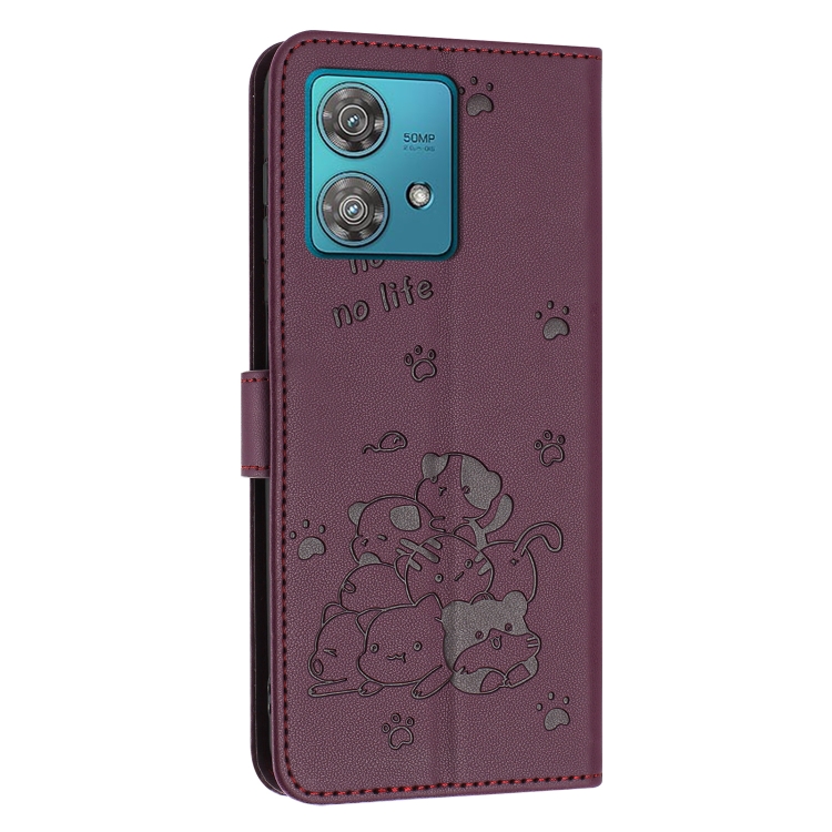 Funda de Cuero Motorola Edge 40 Neo con Diseño de Gatito en Relieve y Cordón (Rojo Vino)