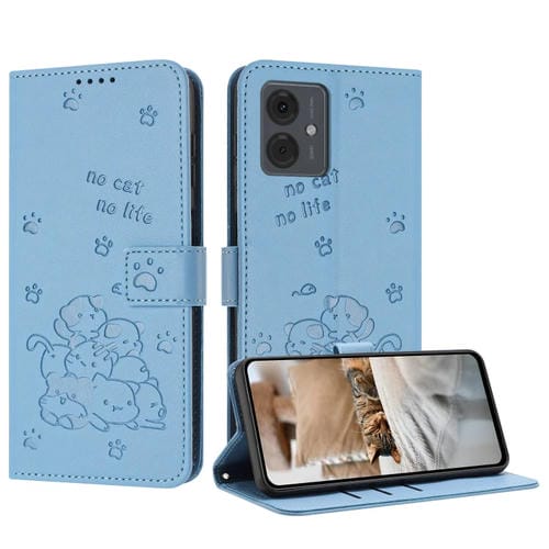 Funda de Cuero Motorola Moto G04/G24/G04S con Diseño de Gatito en Relieve y Cordón (Azul)