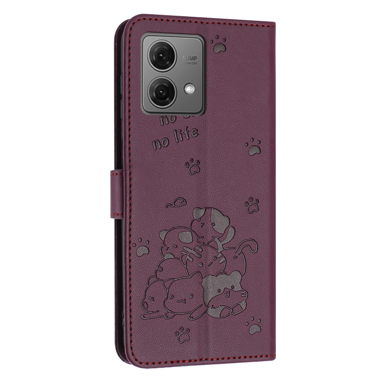 Funda de Cuero Motorola Moto G84 con Diseño de Gatito En Relieve y Cordón (Rojo Vino)