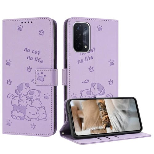 Funda de Piel con Diseño de Gatito En Relieve y Cordón para Oppo A74 5G / A93 5G (Morado)