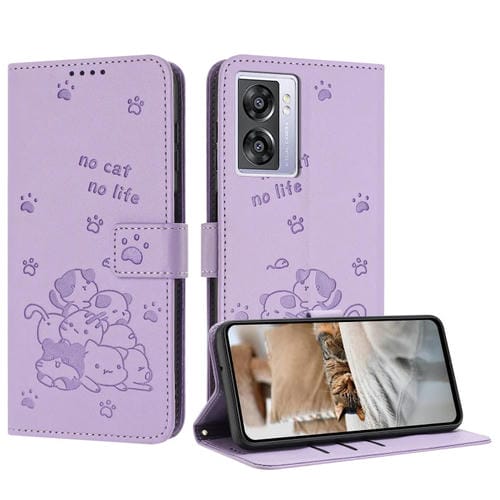 Funda de Cuero con Diseño de Gatito En Relieve para Oppo A77 5G con Cordón (Morado)