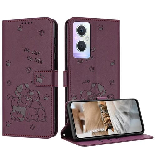 Funda de Piel con Diseño de Gatito En Relieve para Oppo Reno7 Z Global con Cordón (Rojo Vino)