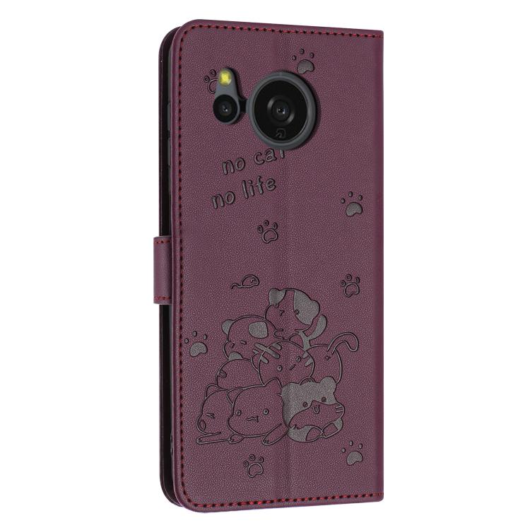 Funda de Cuero para Sharp Aquos Sense 8 con Diseño de Gatito en Relieve y Cordón (Rojo Vino)