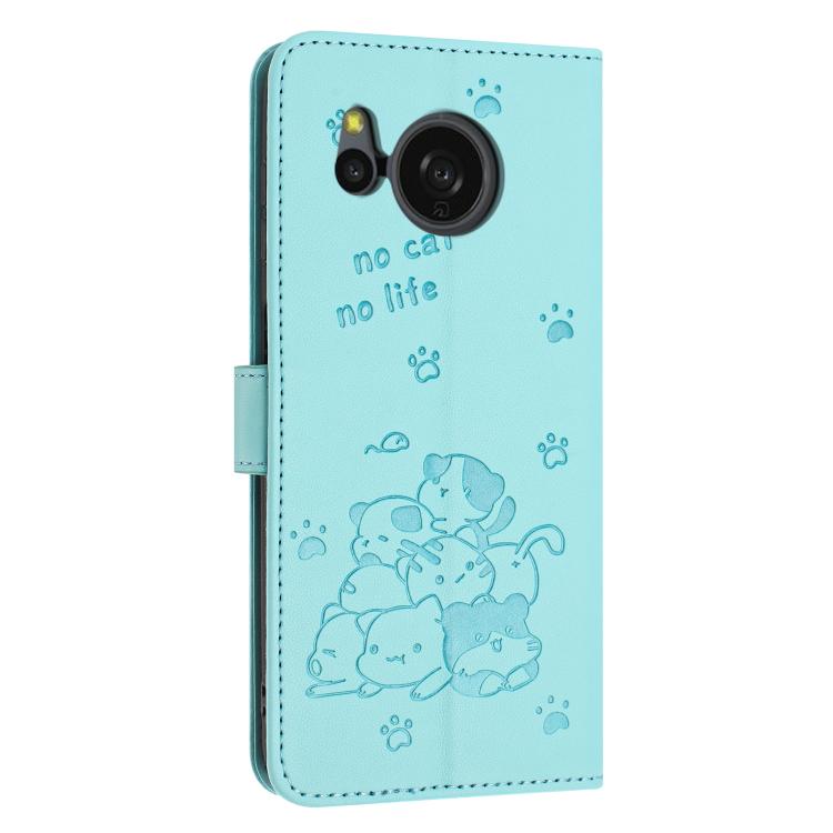 Funda de Cuero para Sharp Aquos Sense 8 con Diseño de Gatito En Relieve y Cordón (Verde Menta)