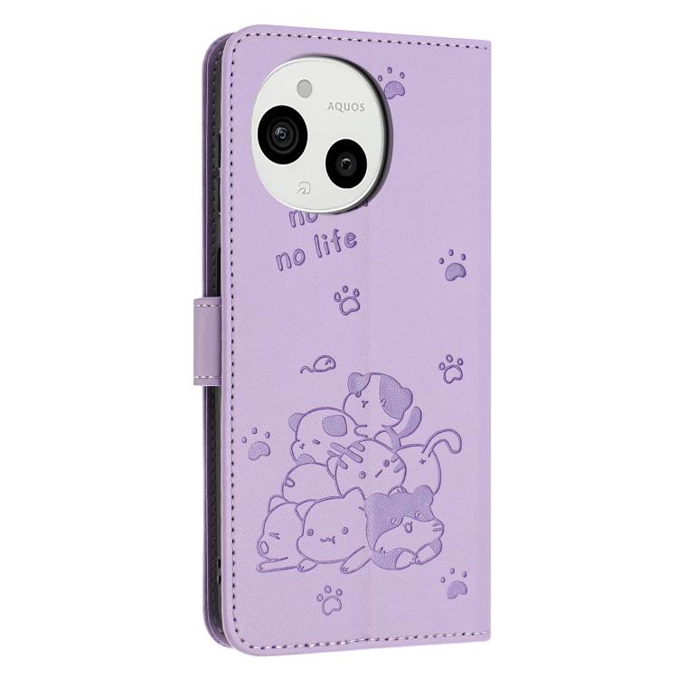 Funda de Cuero para Sharp Aquos Sense 9 con Diseño de Gatito En Relieve y Cordón (Morado)