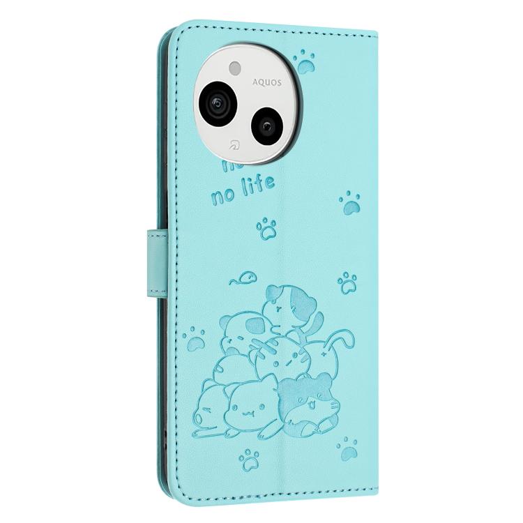 Funda de Cuero para Sharp Aquos Sense 9 con Diseño de Gatito en Relieve y Cordón (Verde Menta)