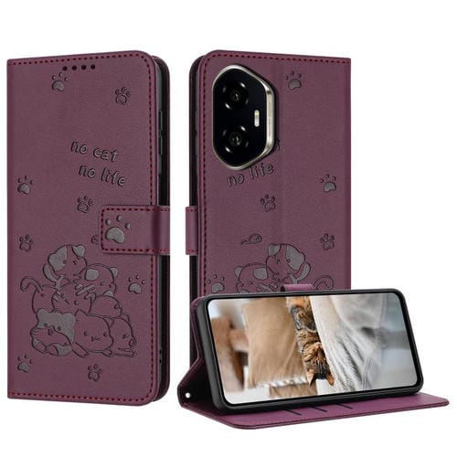 Funda de Piel para Honor 300 con Diseño de Gatito en Relieve y Cordón (Rojo Vino)