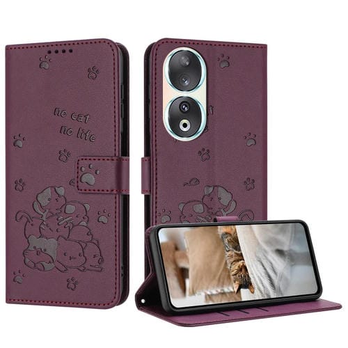 Funda de Piel para Honor 90 con Diseño de Gatito en Relieve y Cordón (Rojo Vino)