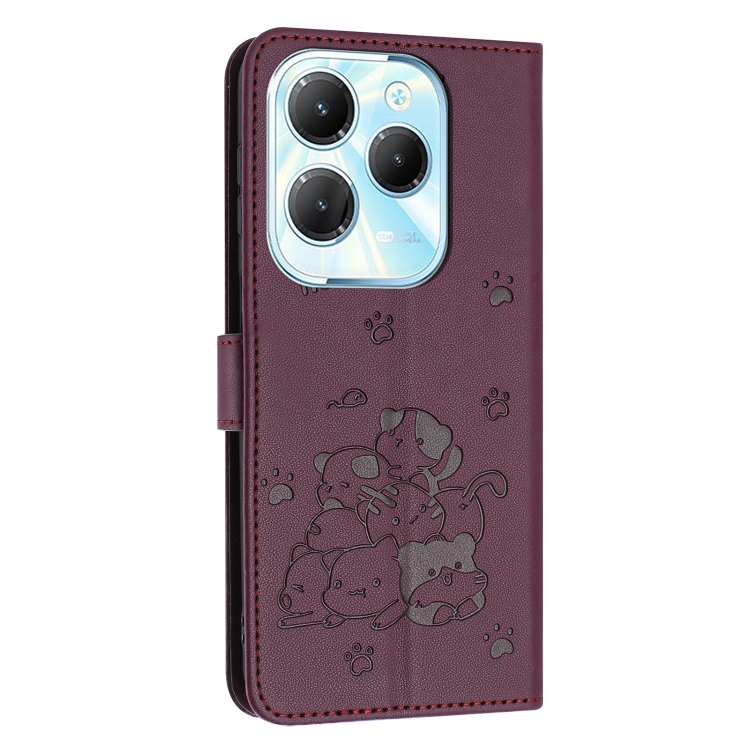 Funda de Cuero Infinix Hot 40 4G y 40 Pro 4G con Diseño de Gatito en Relieve y Cordón (Rojo Vino)