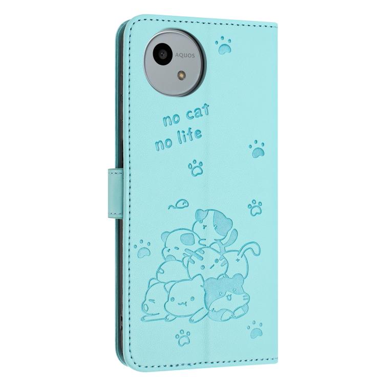 Funda de Cuero para Sharp Aquos Wish4 Sh-52E con Diseño de Gatito en Relieve y Cordón (Verde Menta)