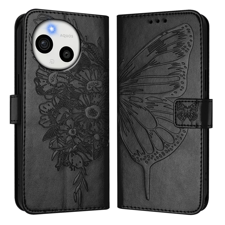 Funda de Cuero para Sharp Aquos Sense9 con Diseño de Mariposa en Relieve (Negra)