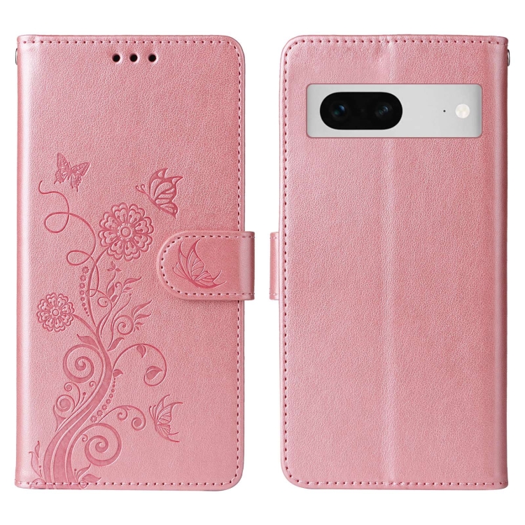 Funda de Cuero para Google Pixel 7 con Diseño de Mariposas y Flores en Relieve (Oro Rosa)