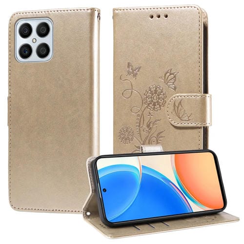 Funda de Cuero para Honor X8 4G/X30I/Play 6T Pro con Diseño de Mariposas y Flores en Relieve (Dorada)