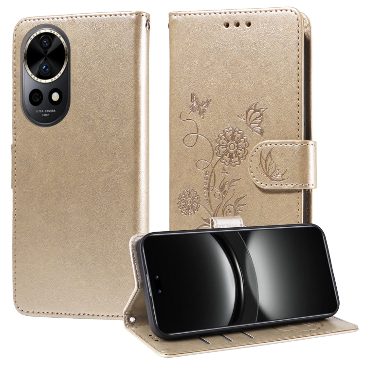 Funda de Cuero Huawei Nova 12 Pro/Nova 12 Ultra con Diseño de Mariposas y Flores en Relieve (Dorada)