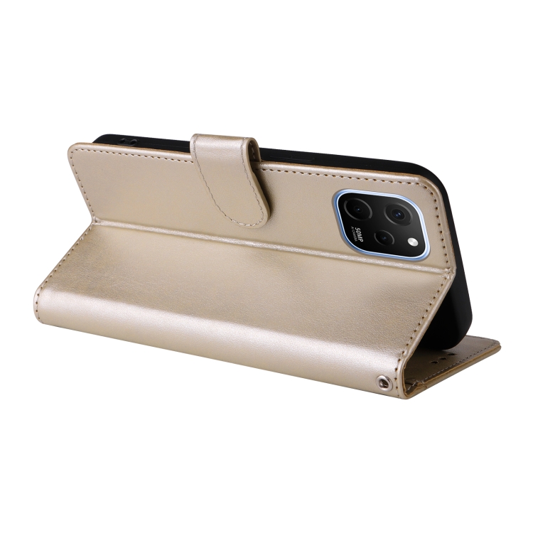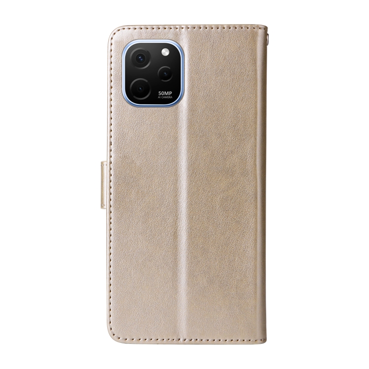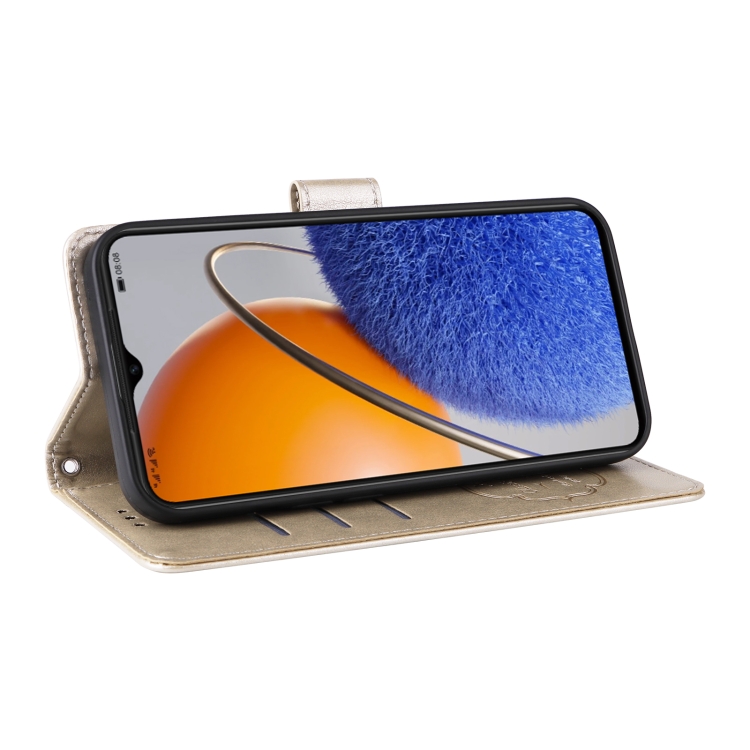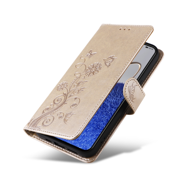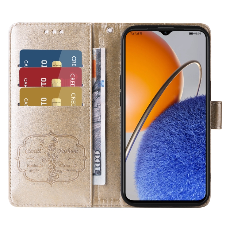 Funda de Cuero Huawei Nova Y61 Enjoy 50Z Diseño Mariposas y Flores En Relieve (Dorada)